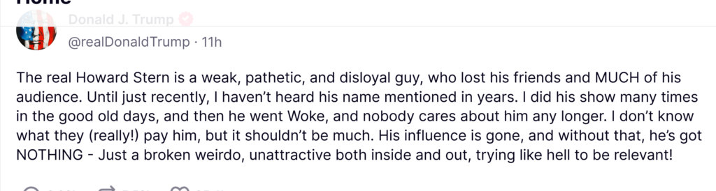 What did Howard say to provoke such invective? Trump is responding a few days late to Howard’s comment to Variety that he’s “proudly woke” and anti-Trump. Stern has grown and matured by leaps and bounds since his days as a “shock jock,” and his audience has matured with him.