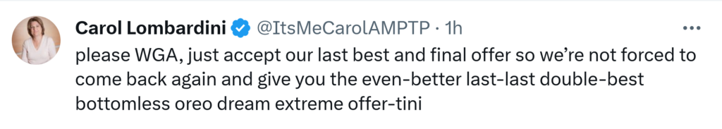 Carol Lombardini, chief negotiator for the AMPTP aka the Studios, wrote this on Twitter about an hour ago: “please WGA, just accept our last best and final offer so we’re not forced to come back again and give you the even-better last-last double-best bottomless oreo dream extreme offer-tini.”