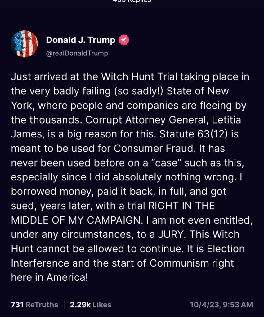 “Just arrived at the Witch Hunt Trial taking place in the very badly failing (so sadly!) State of New York, where people and companies are fleeing by the thousands. Corrupt Attorney General, Letitia James, is a big reason for this. Statute 63(12) is meant to be used for Consumer Fraud. It has never been used before on a “case” such as this, especially since I did absolutely nothing wrong. I borrowed money, paid it back, in full, and got sued, years later, with a trial RIGHT IN THE MIDDLE OF MY CAMPAIGN. I am not even entitled, under any circumstances, to a JURY. This Witch Hunt cannot be allowed to continue. It is Election Interference and the start of Communism right here in America!”