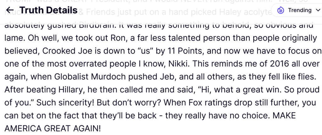 “Fox has totally given up on Ron DeSanctimonious, and is on their next “journey” pushing Nikki “Birdbrain” Haley, who stated loudly and often that “President TRUMP was a GREAT President, and I would NEVER run against him.” Well, so much for that! Fox & Friends just put on a hand picked Haley acolyte who absolutely gushed Birdbrain. It was really something to behold, so obvious and lame. Oh well, we took out Ron, a far less talented person than people originally believed, Crooked Joe is down to “us” by 11 Points, and now we have to focus on one of the most overrated people I know, Nikki. This reminds me of 2016 all over again, when Globalist Murdoch pushed Jeb, and all others, as they fell like flies. After beating Hillary, he then called me and said, “Hi, what a great win. So proud of you.” Such sincerity! But don’t worry? When Fox ratings drop still further, you can bet on the fact that they’ll be back – they really have no choice. MAKE AMERICA GREAT AGAIN!”