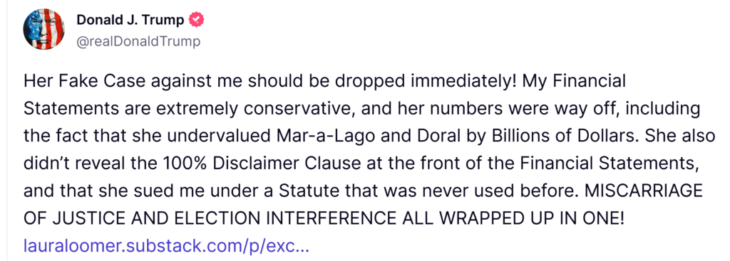 On his Truth Social he’s linked to an article written by nutjob Laura Loomer. In the article, she reprints the home address of New York Attorney General Letitia James.