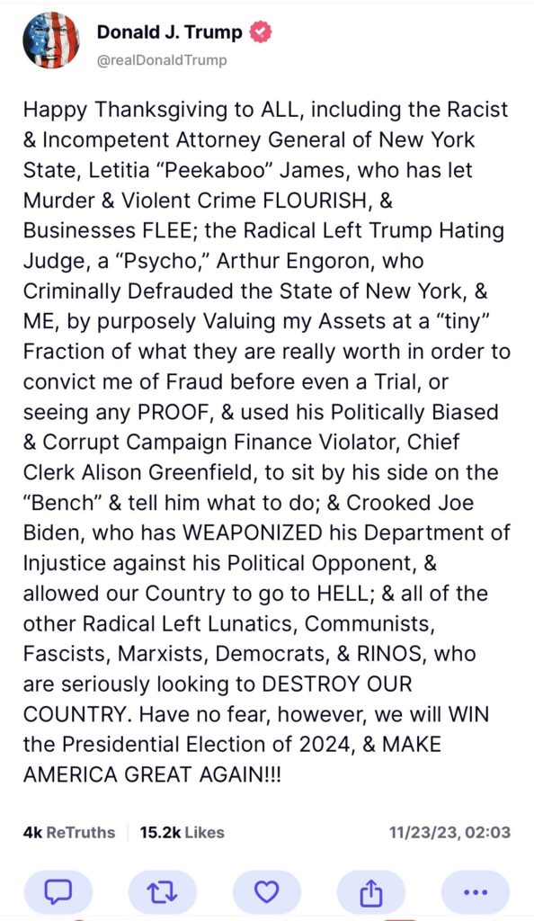 What is Trump thankful for? Nothing. He just hates everyone, especially NY Attorney General Letitia James and Judge Arthur Engoron.