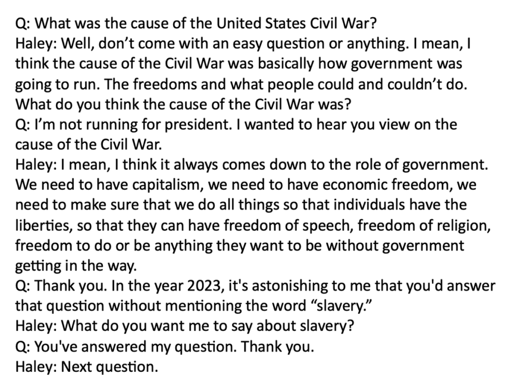 Haley’s answer for what caused the Civil War? “I mean, I think the cause of the Civil War was basically how government was going to run. The freedoms and what people couldn’t do.”