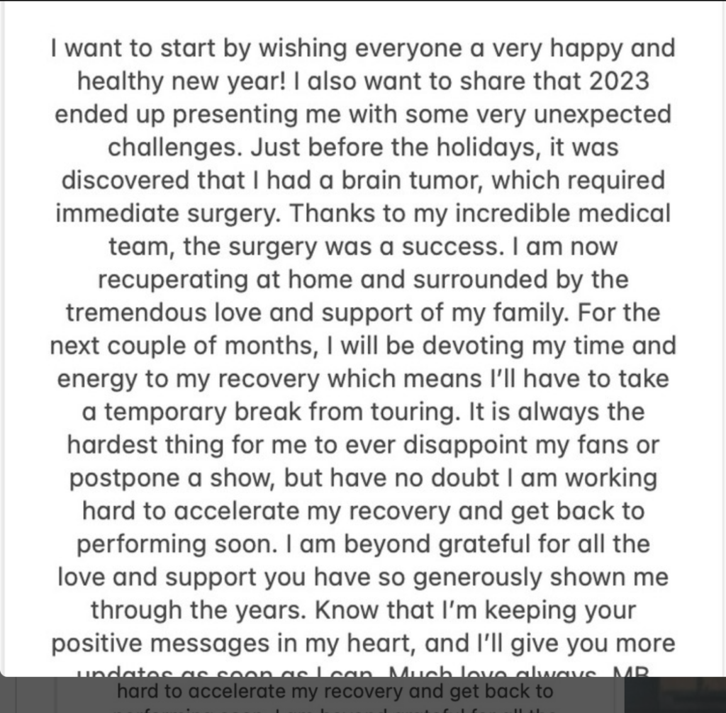 Michael Bolton has posted a note to fans explaining his ill health. He was diagnosed with a brain tumor before the holidays and had surgery to remove it.