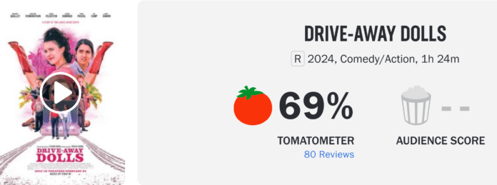Not kidding– Ethan Coen’s “Drive Away Dolls” is rated at 69% on Rotten Tomatoes.