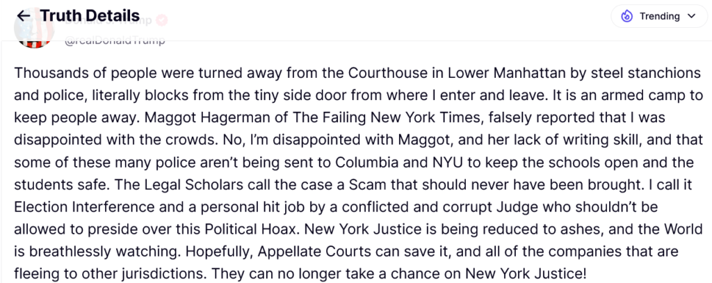 “Thousands of people were turned away from the Courthouse in Lower Manhattan by steel stanchions and police, literally blocks from the tiny side door from where I enter and leave. It is an armed camp to keep people away. Maggot Hagerman of The Failing New York Times, falsely reported that I was disappointed with the crowds. No, I’m disappointed with Maggot, and her lack of writing skill, and that some of these many police aren’t being sent to Columbia and NYU to keep the schools open and the students safe. The Legal Scholars call the case a Scam that should never have been brought. I call it Election Interference and a personal hit job by a conflicted and corrupt Judge who shouldn’t be allowed to preside over this Political Hoax. New York Justice is being reduced to ashes, and the World is breathlessly watching. Hopefully, Appellate Courts can save it, and all of the companies that are fleeing to other jurisdictions. They can no longer take a chance on New York Justice!”