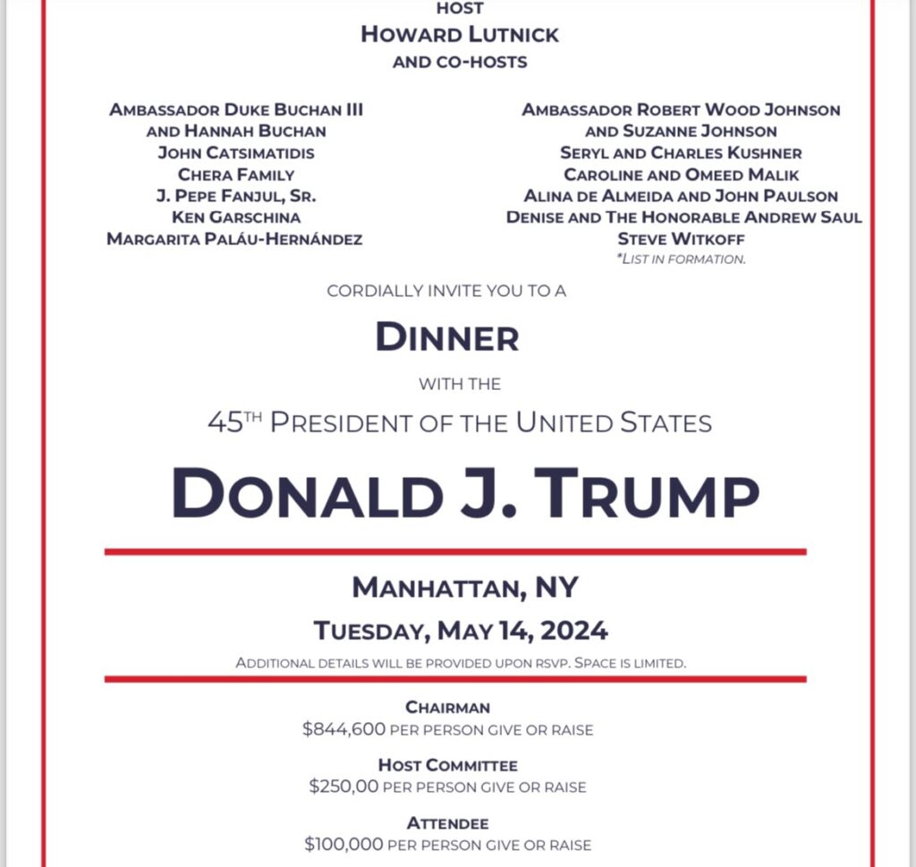 Other hosts include Charles Kushner, ex con and father of Jared, who made billions with the Saudis and is Trump’s son-in-law; Gristedes owner John Catsimitidis is also a host; so is New York Jets owner Woody Johnson; billionaire John Paulson; Cuban born sugar billionaire Pepe Fanjul; billionaire landlord and one time Trump witness Steve Witkoff, and hedge funder Omeed Malik, who was dismissed — according to the New York Times — from Bank of America in 2018 after an internal investigation into a young female banker’s accusation of inappropriate sexual conduct. Malik has his own firm now and is a minority partner in the neo-right Daily Caller.