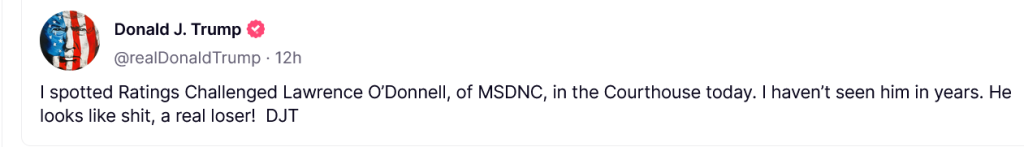 Last night on social media, Trump ranted that he spotted MSNBC’s Lawrence O’Donnell in court. “He looks like shit,” said the ever gracious rapist. I’m sure it irks Trump that O’Donnell is trim, nicely suited from a tailor, and has his own hair.