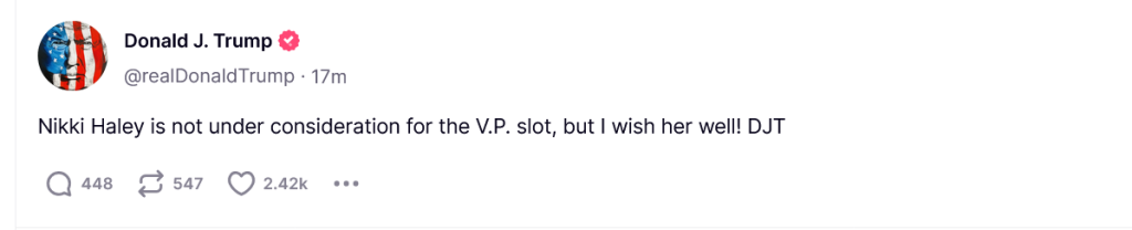 He just scotched that rumor definitively: “Nikki Haley is not under consideration for the V.P. slot, but I wish her well! DJT”