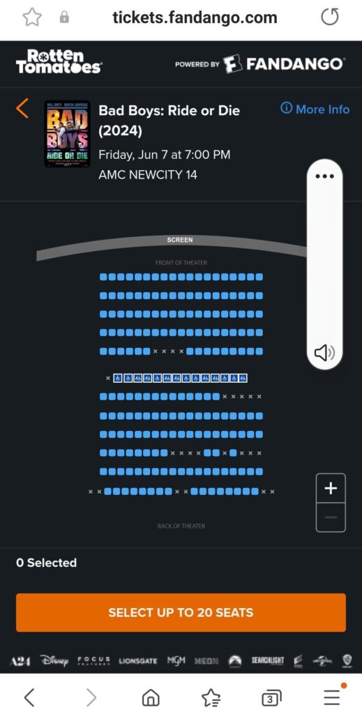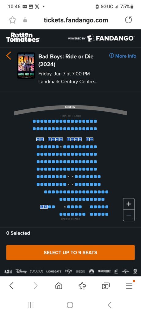 Most theaters have five or six seats sold, and the rest available in standard and IMAX forms.