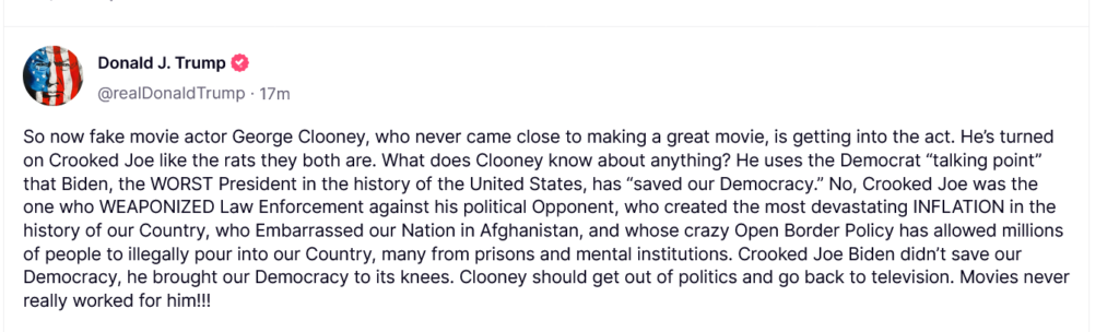 Trump is mad that Clooney wrote a long letter in the NY Times asking Joe Biden to step aside from running from president.