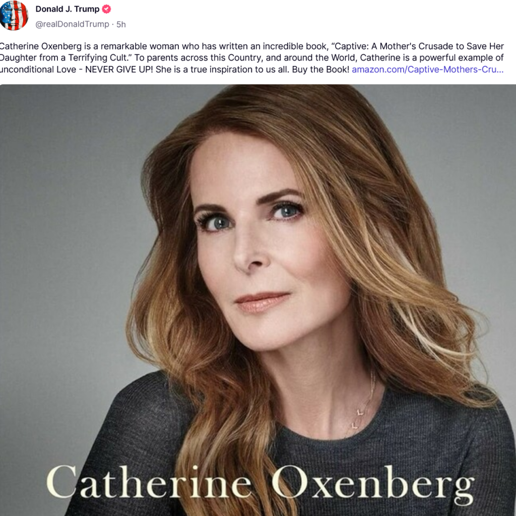 Trump wrote, out of nowhere: “Catherine Oxenberg is a remarkable woman who has written an incredible book, “Captive: A Mother’s Crusade to Save Her Daughter from a Terrifying Cult.” To parents across this Country, and around the World, Catherine is a powerful example of unconditional Love – NEVER GIVE UP! She is a true inspiration to us all.”