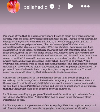 Recently, Bella Hadid was featured in an Adidas ad campaign showing off classic sneakers from the Munich 1972 Olympics. That was the Olympics in which 11 Israeli athletes were murdered by a Palestinian terrorist group called Black September.