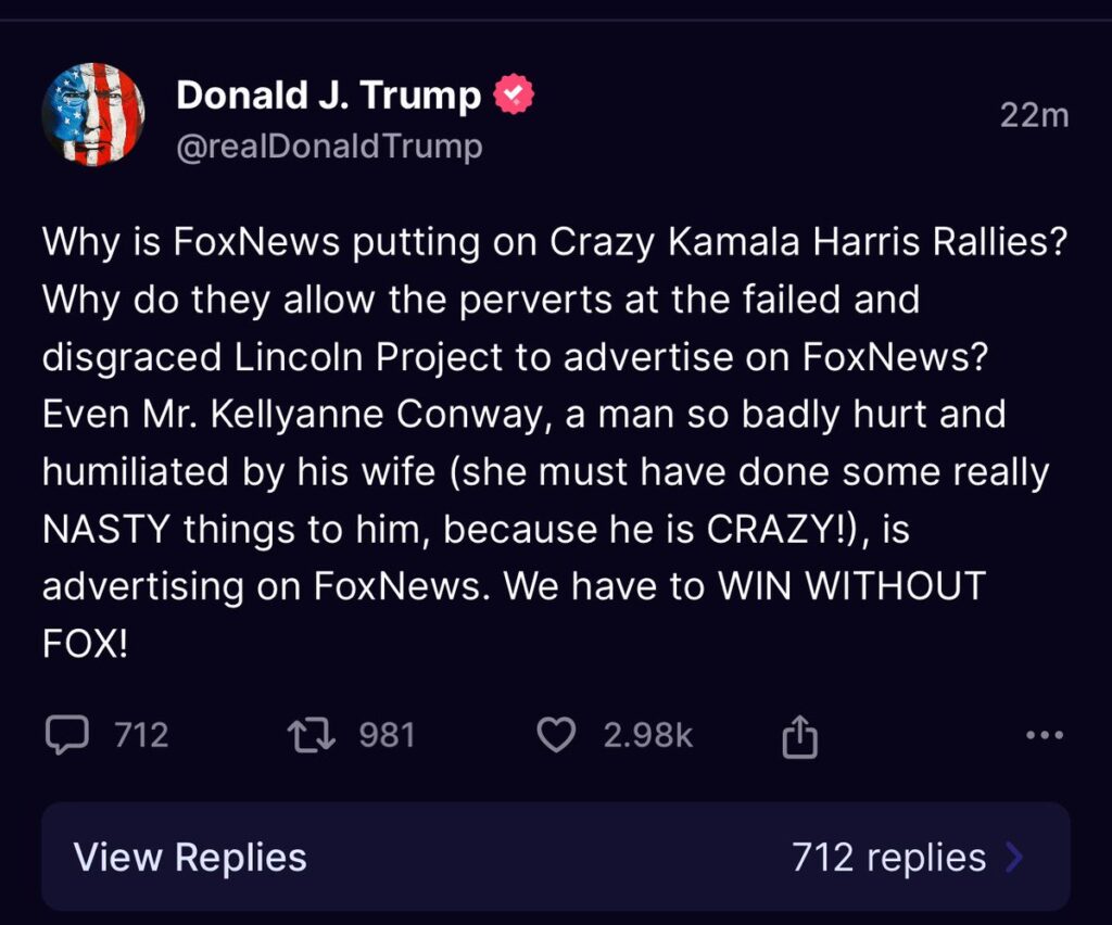 Trump also rails against Fox News, saying to win he must avoid the network. But he only wants to debate future president Harris on Fox News because he thinks they will protect him.