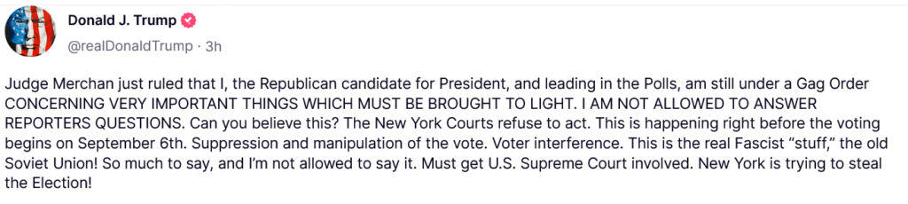 Trump wrote here that he’s not allowed to answer reporters’ questions. This isn’t true. Just not about the hush money case: “Judge Merchan just ruled that I, the Republican candidate for President, and leading in the Polls, am still under a Gag Order CONCERNING VERY IMPORTANT THINGS WHICH MUST BE BROUGHT TO LIGHT. I AM NOT ALLOWED TO ANSWER REPORTERS QUESTIONS. Can you believe this? The New York Courts refuse to act. This is happening right before the voting begins on September 6th. Suppression and manipulation of the vote. Voter interference. This is the real Fascist “stuff,” the old Soviet Union! So much to say, and I’m not allowed to say it. Must get U.S. Supreme Court involved. New York is trying to steal the Election!”