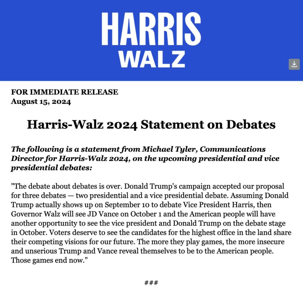 Kamala Harris’s campaign says “the debate over debates is over.”