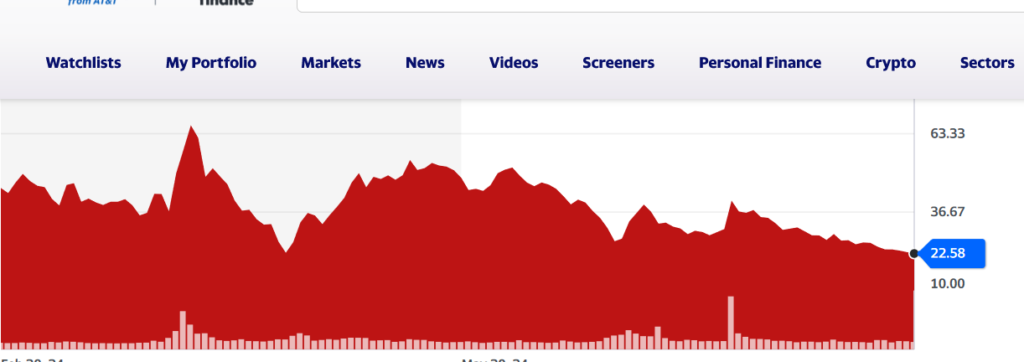 The stock price of Trump Media fell to $22.56 at 12:30pm. Trump Media is the stock name for Truth Social, Trump’s failing social media business.
