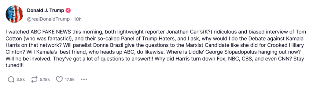 Trump writes: “I watched ABC FAKE NEWS this morning, both lightweight reporter Jonathan Carl’s(K?) ridiculous and biased interview of Tom Cotton (who was fantastic!), and their so-called Panel of Trump Haters, and I ask, why would I do the Debate against Kamala Harris on that network? Will panelist Donna Brazil give the questions to the Marxist Candidate like she did for Crooked Hillary Clinton? Will Kamala’s best friend, who heads up ABC, do likewise. Where is Liddle’ George Slopadopolus hanging out now? Will he be involved. They’ve got a lot of questions to answer!!! Why did Harris turn down Fox, NBC, CBS, and even CNN? Stay tuned!!!”
