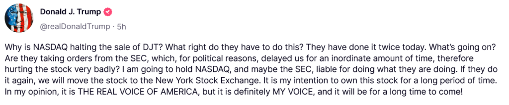 Here’s the video from Friday. Go to 1:50 in the video to hear the bit about Trump Media having “the biggest increase in the history of the stock market.”