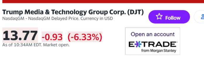 Trump Media stock is in the $13 range right now. If it drops below $12 Trump will not be able to sell his shares.