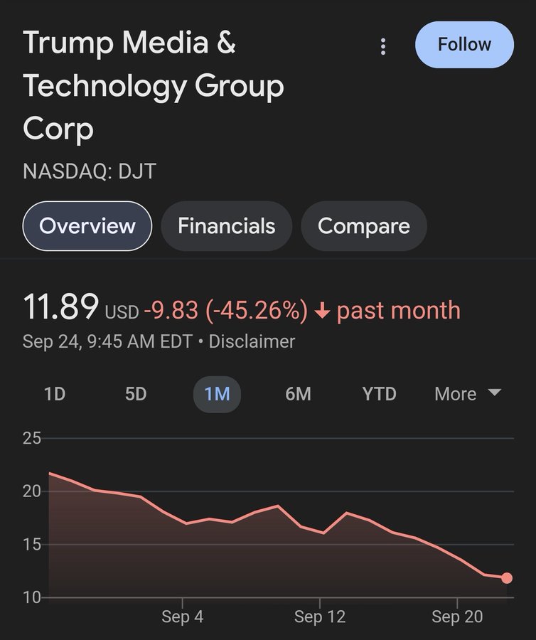 Seriously, Trump Media may be on the pink sheets soon. It’s worthless. Down 83% in six months.