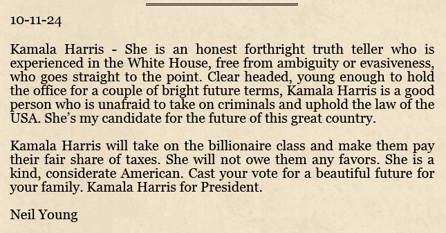 But times have changed, and Young — who’s been political for 50 years — has urged his fans to vote for Harris.