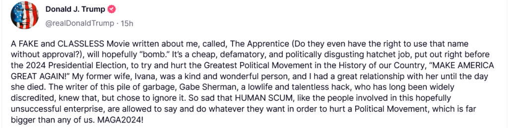Donald is so out of it he’s just now attacking the movie, “The Apprentice,” after it flopped over the weekend.