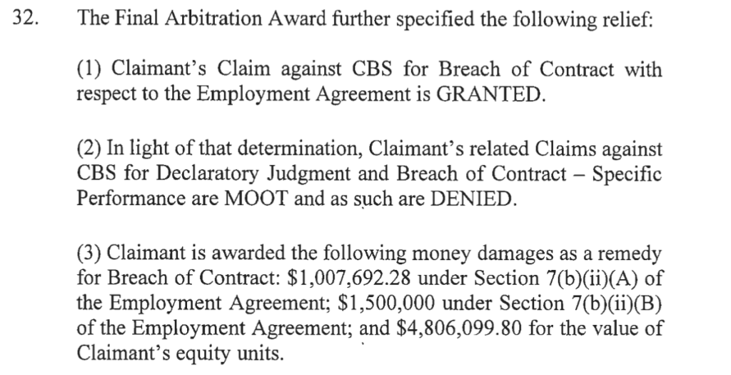According to the motion, the Arbitrator wrote: CBS breached Section 7 of the Employment Agreement as a matter of New York law on October 1, 2021, when it purported to “convert” Mr. Dunn’s prior termination to “for Cause”, and thereafter ceased all severance payments and