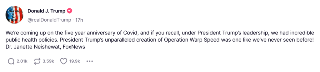 Donald Trump celebrated the 5th anniversary of the start of COVID today on social media.