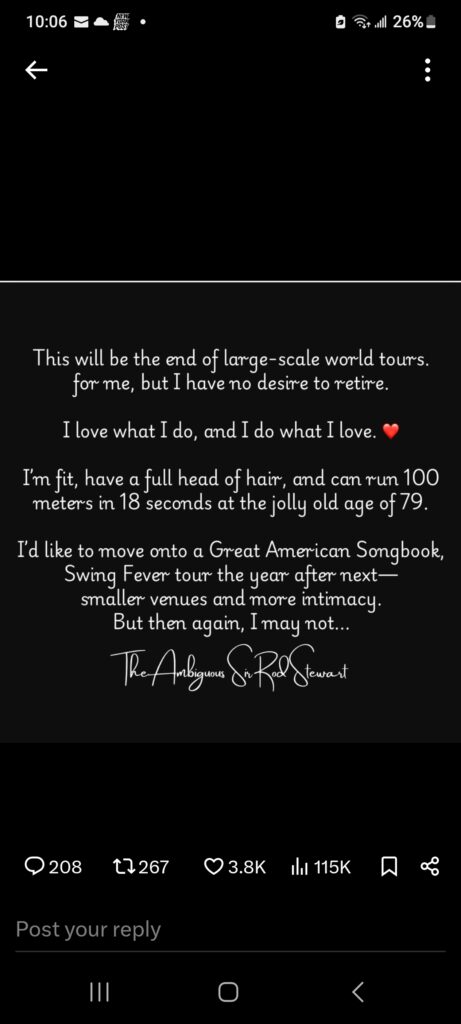 But Rod, famous and beloved for dozens of hits like “Maggie May” and “Do You Think I’m Sexy” says he has “no desire to retire” in an Instagram statement. He will, however. cut back on huge stadium and arena tours.
