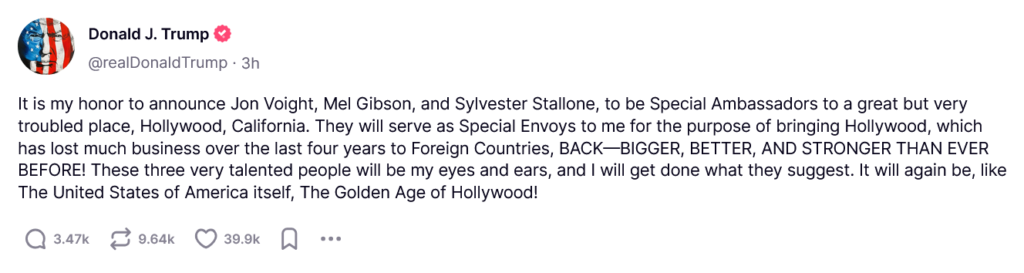 Of course, the whole “special envoy for Hollywood” thing is meaningless. But it’s Trump trying to rile the Hollywood establishment, appeal to the Christian right, and again, pay back theses shmeggeggies for speaking up for him. I’m surprised he didn’t add Dennis Quaid or James Woods to the list. They must be very disappointed!