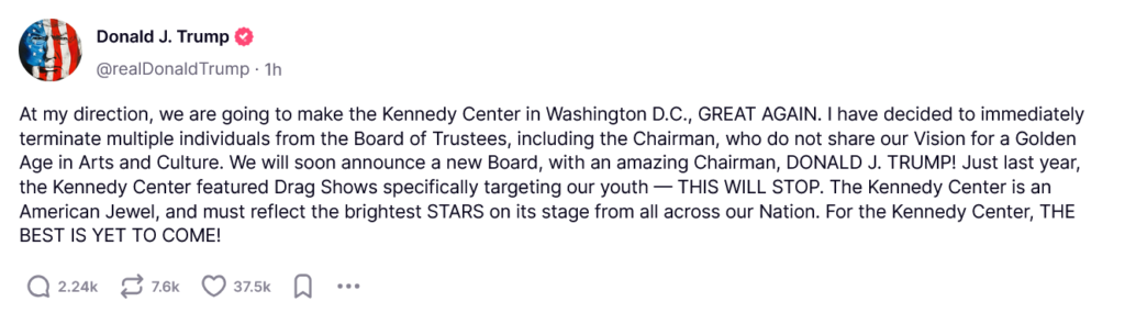 He writes: “At my direction, we are going to make the Kennedy Center in Washington D.C., GREAT AGAIN. I have decided to immediately terminate multiple individuals from the Board of Trustees, including the Chairman, who do not share our Vision for a Golden Age in Arts and Culture. We will soon announce a new Board, with an amazing Chairman, DONALD J. TRUMP! Just last year, the Kennedy Center featured Drag Shows specifically targeting our youth — THIS WILL STOP. The Kennedy Center is an American Jewel, and must reflect the brightest STARS on its stage from all across our Nation. For the Kennedy Center, THE BEST IS YET TO COME!”