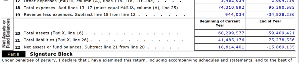 The NFL itself is no longer reporting numbers, but they still have a NFL Foundation. Their total reported assets for 2022-23 — found in their Form 990 tax filing — were MINUS $15.8 million.