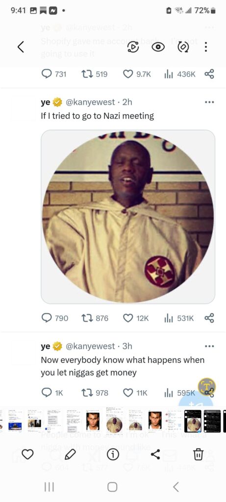 Yes, he’s a sick sick man. But he also has millions of followers. Elon Musk refuses to remove his account from X, and West knows he has a captive audience for his disgusting thoughts.