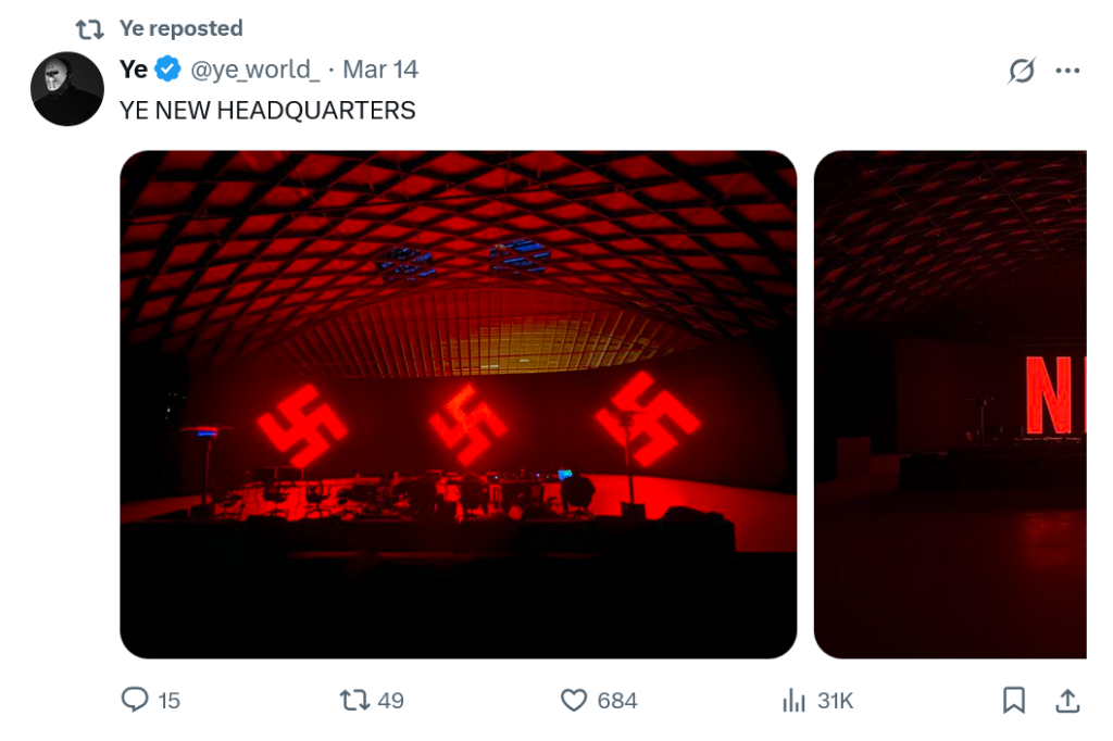 He also posted a photo of his new logo — the Nazi SS sign — and a photo of his new world headquarters in whicb bright red swastikas are prpjected on the wall.