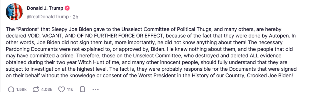 Trump says — and this is all a lie — that Biden knew nothing about the pardons and they don’t count because he signed them in AutoPen. He says evenyone who was pardoned by Biden “should fully understand that they are subject to investigation at the highest level.”