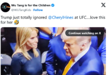 This is too good. Pretty, pretty, pretty good! Donald Trump either didn’t remember who Cheryl Hines was tonight at UFC 314, that she’s Robert Kennedy Jr’s wife, or he actually snubbed her. The latter seems to be the case. In all the videos of the meeting between Trump and the Kennedys you’ll see: Hines extends … Continue reading LOL Watch Donald Trump Brutally Snub Cheryl Hines, aka Mrs. RFK Jr, With Hand Extended for A Shake, at UFC Match