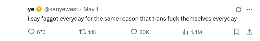Kanye can’t post on Instagram, where he’s banned for all his offensive and frankly, disgusting posts. But he’s more than welcome on Twitter X, owned by Elon Musk, where he runs a kind of ghost account that is not easily found because it has a yellow check mark, meaning it’s a Verified Account for which West pays Musk top dollar..