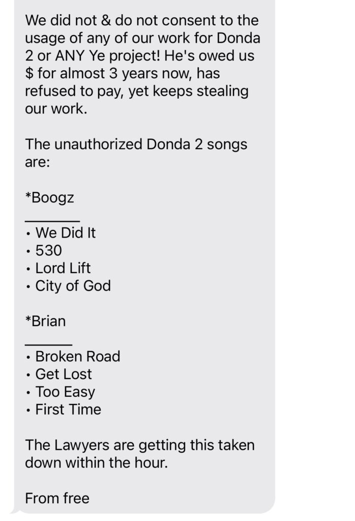 Kanye himself posted a take down letter from Free Maiden, a music group run by DeAndre “Free” Maiden, that says he hasn’t cleared samples on the album and owes their producers fees for three years for previous work. They say: “He’s owed us $ for almost 3 years now, has refused to pay yet keeps stealing our work.”