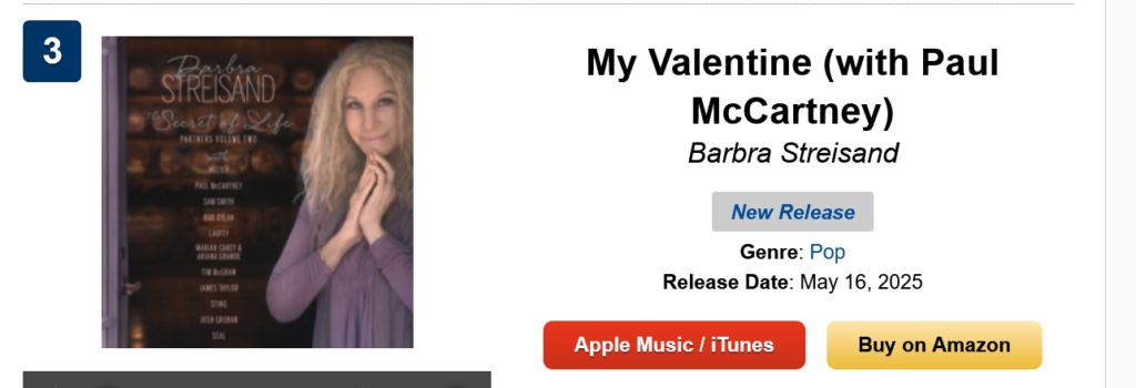 Barbra’s duets album arrives June 27th. “My Valentine” may still be on the charts then!