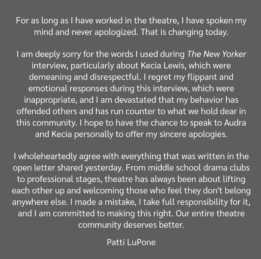 Lupone is apologizing after the dreadful — and maybe racist — things she said about fellow performers Audra McDonald and Kecia Lewis.