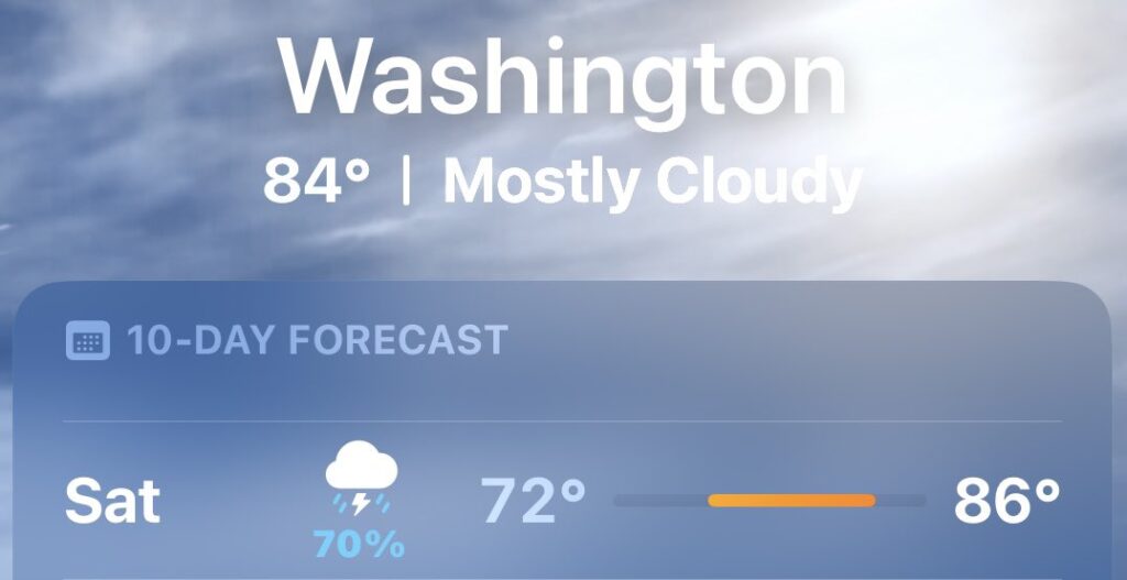 In Washington, Donald Trump’s military parade is going to be washed out. The report is 47% chance of rain and thunderstorms, especially in the afternoon. It will be nice and hot at 83 degrees. Similar weather is expected for Sunday, so the parade can’t just be put off by a day.