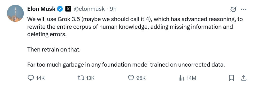 He says on X (Twitter): “We will use Grok 3.5 (maybe we should call it 4), which has advanced reasoning, to rewrite the entire corpus of human knowledge, adding missing information and deleting errors.