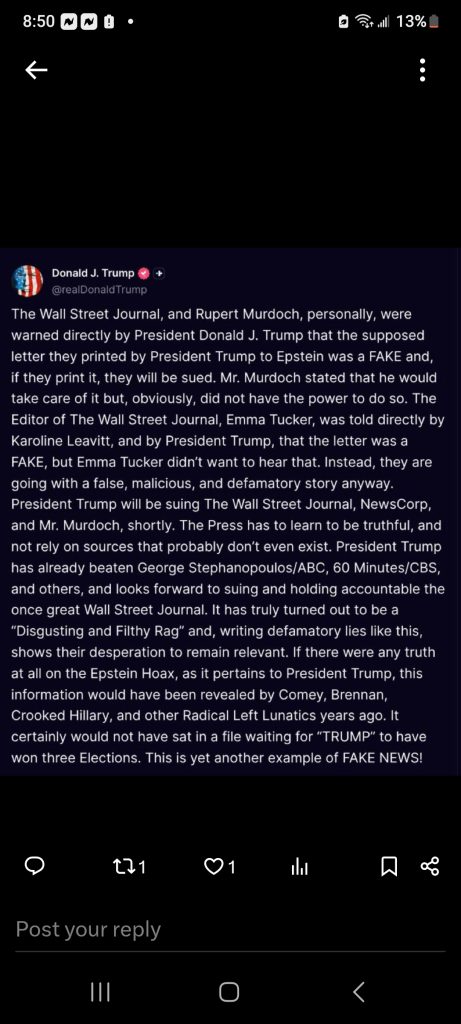 Rupert’s Wall Street Journal is claiming that Trump once sent Jeffrey Epstein a raunchy birthday card. Trump says it’s a fake. Will Murdoch capitulate or retract? Read the story at wsj.com.