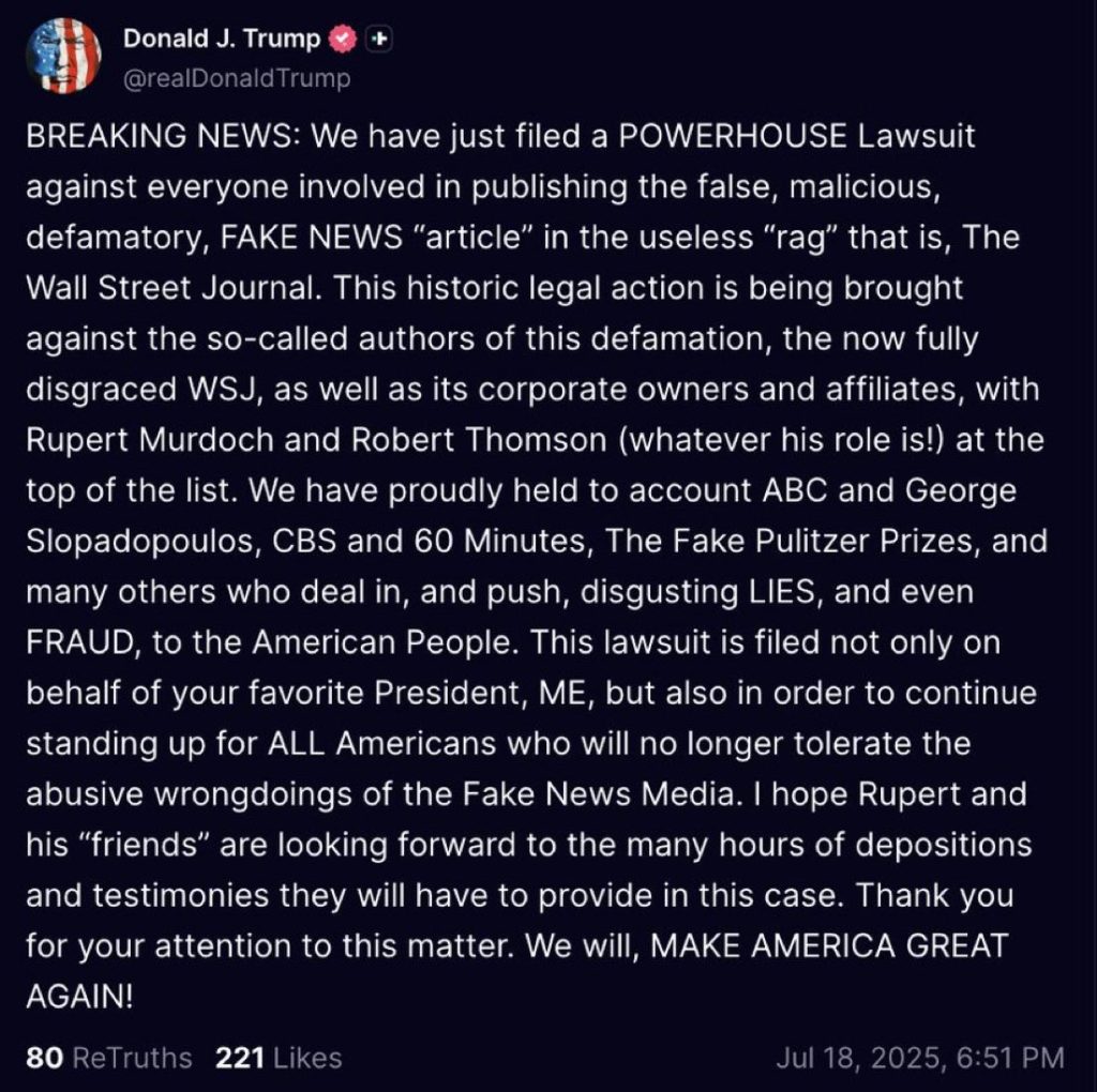 Trump had a lot of luck suing ABC and George Stephanopolous and CBS over “60 Minutes.” The people he dealt with were cowards. But Murdoch is not going to give in the same way. He’s loaded, and reports to himself. As long as the WSJ reporting is solid, Murdoch is not going to jeopardize his worldwide operation.