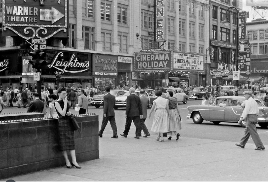 “The Fantastic Four” is also a throwback kind of film in that Shakman has managed to work in product placements galore that don’t seem out of place. Canada Dry, 7 Up (do they still make it?) are prominently billboarded.When I saw Leighton’s, and the RKO Theater, I thought I was in a dream. I’ve included a real photo below that the designers obviously studied.Â