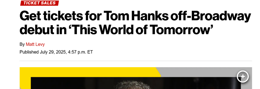 Right now, the Post is running advertorial for Vivid Tickets. The ticket reseller is charging $691 for the best seats at The Shed to see Hanks in a new play based on his short story, “The World of Tomorrow.” Advertorial means it’s an ad from Vivid Tickets that looks like a Post story with a real byline.