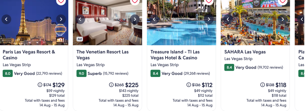 It’s hotels that tell the story, though. They are all open and taking reservations on hotels.com. That includes everything from the fancy Wynn ($323 a night) and the Four Seasons ($257) to Harrah’s (85 bucks, baby).