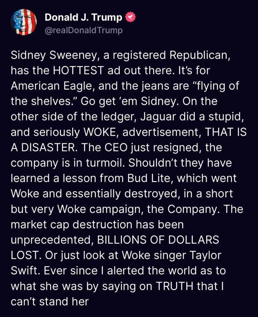 Trump: Sydney Sweeney is a registered Republican? Now I love her ad. If she is a registered Republican, I think her ad is fantastic pic.twitter.com/ylJeb5OUks
