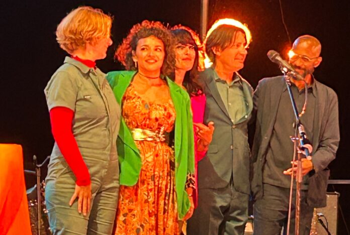 Jones, in a green jacket, sequined tiger on her back, over dress and silver high heels, took the stage singing her signature “What Am I to You?” Accompanied by a first-rate band she introduced songs from her 2024 Grammy winning album, “Visions.” This being the very tip of Long Island, surrounded by ocean, she sang from “Queen of the Sea: “I Just Want to Dance,” slow moving and sexy, “Sunrise, Sunlight, ooh, ooh, ooh,” and “Come Away with Me.” At times on keyboards, and then on guitar, she’s a virtuoso musician, jazzy, and with Sasha Dobson providing additional vocals and guitar, the pair resonated girl power.